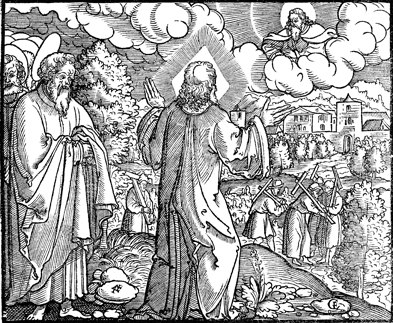 Description: Jesus invites the weary and heavy laden, depicted with crosses, to come to him and receive rest. The engraver's knife and monogram (CE) are placed to the lower right, and the 4-cross in the lower left.
