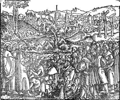 Description: Jesus teaches the crowds in the wilderness as his disciples look on.