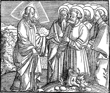 Description: Jesus teaches his disciples. The engraver's knife and monogram (CE) are placed in the lower left and the 4-cross is in the lower center.