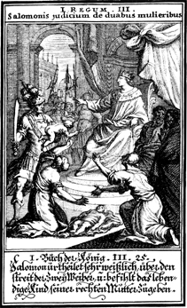 Description: Solomon appears on his throne as two women approach, both claiming custody of a baby. Solomon's servant stands with drawn sword to divide the child between the two women.
