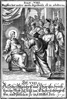 Description: The teachers of the law and the Pharisees ask Jesus what should be done to the woman caught in the act of adultery.