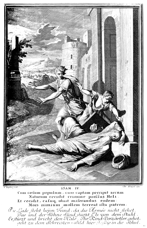 Description: As the Philistines and Israelites battle in the background, Eli falls and breaks his neck after hearing the Ark of the Covenant was captured in battle.