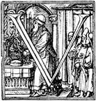 Description: The initial letter V shows the high priest coming before a table with the bread of presence and the tablets of Ten Commandments.