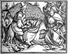 Description: Balaam beats his donkey for stopping as an angel stands in its way with sword raised.