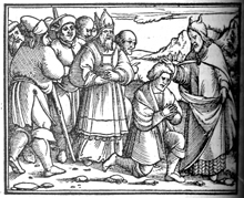 Description: Moses lays his hand on a kneeling Joshua in view of the whole congregation to signify Joshua's appointment as his successor.