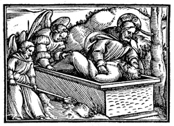 Description: God lays Moses in a tomb, as two angels gather to assist in the burial.