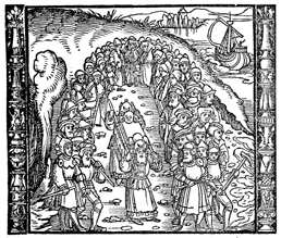 Description: The Israelites cross the Jordan River as the priests hold the Ark of the Covenant in the middle of the river.