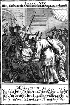 Description: The Pharisees protest the charge Jesus of Nazareth, the King of the Jews.