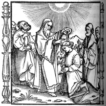 Description: Samuel anoints David king of Israel in the presence of his father and brothers. His attribute, the harp is before him on the ground.