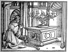 Description: Solomon kneels before the menorah in prayer to ask God for wisdom.