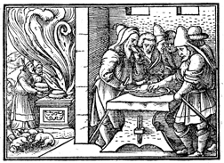 Description: As a fire blazes on an altar outside with slaughtered sheep at its base, priestly figures place loaves of bread on the altar. Inside a group of men stand about a table and eat the Passover with their staffs in hand.