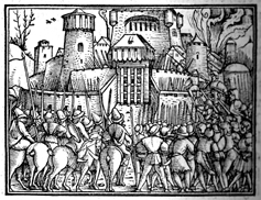 Description: An army assaults and sets fire to a walled city. Perhaps this is intended to portray the Gentile attack on Dathema, which Judas Maccabeus and the Jews sought to relieve.