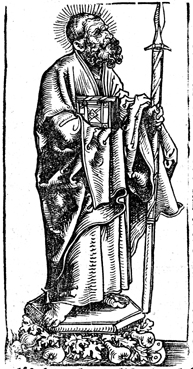 Description: The Apostle Thomas stands with a book and spear in hand.