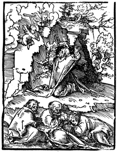 Description: Jesus prays in the Garden of Gethsemane, as his three disciples/apostles (Peter, James, and John) sleep and two angels bring a cross from the clouds to him.