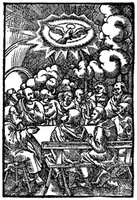 Description: The Holy Spirit Descends on the Apostles in the form of a dove, as they sit on benches around a table.