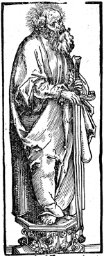 Description: From the Hortulus animae or Lustgarten der Seelen and based on the sketches of Lucas Cranach, the Elder (1472-1553), this portrayal of the apostle shows him in typical fashion as an older man with the attribute of the sword (according to tradition, the instrument of his execution)..