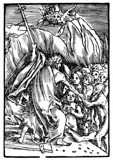 Description: Having broken down the gate of Hell/Hades, Jesus proclaims salvation to those within. The demonic beasts of the netherworld threaten him from above and below. This was to have occurred between Jesus’ crucifixion and resurrection. This woodcut was created by Lukas Cranach the Elder.