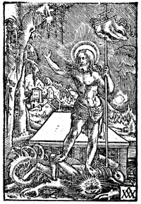 Description: The triumphant Christ stands outside the tomb, having conquered death. The artist’s monogram A-W is set at the lower right. This woodcut was created by Lukas Cranach the Elder .
