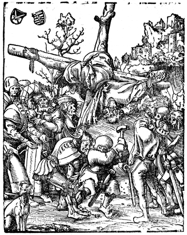 Description: According to Christian tradition, the Apostle Peter was crucified upside-down. This woodcut was created by Lukas Cranach the Elder .