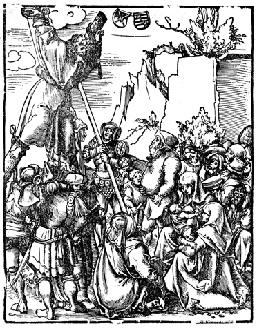 Description: From the Hortulus animae or Lustgarten der Seelen and based on the sketches of Lucas Cranach, the Elder (1472-1553), this scene depicts the crucifixion of the Apostle Andrew on a cross in the shape of an “X”. According to Christian tradition, Andrew was crucified by Aegeas, the proconsul of Patras (located in the North-West of the Peloponnese of Greece), and affixed to the wooden beams with ropes—rather than nails—to prolong his agony. Although one tradition indicates that he was crucified upside down, he is shown upright here. The Electoral and Ducal arms of Saxony are set at the top of the engraving. This woodcut was created by Lukas Cranach the Elder .