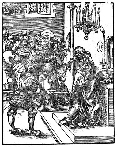 Description: The Apostle Thomas was martyred with a spear, according to some Christian tradition; the electoral and ducal arms of Saxony hang on the wall. This woodcut was created by Lukas Cranach the Elder .
