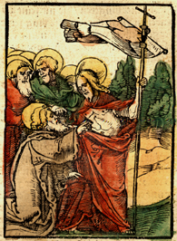 Description: Jesus converses with his disciples while holding the cross banner.