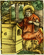 Description: A rendering of Mark at his writing desk with his attribute, the lion, nearby.