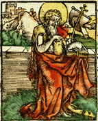 Description: John the Baptist with his attribute, a lamb standing on a book with a cross and banner.