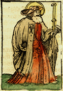 Description: A rendering of St. James with his attributes, the spear and the crossed swords.