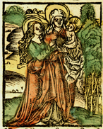 Description: The prophetess Anna holds the baby Jesus with Mary alongside.