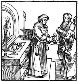 Description: A pastor serves communion in front of an altar depicting a saint.