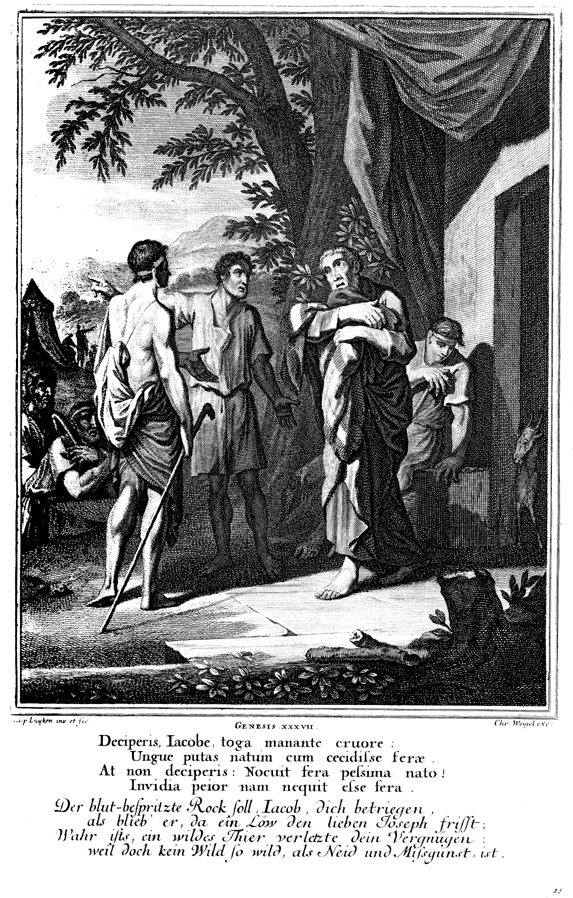 Description: Jacob embraces the garment he made for his beloved son, Joseph, after his sons dipped it into goat’s blood, and deceived Jacob into thinking that an animal had devoured Joseph. The names of the artist, Caspar Luyken (1672-1708), and the printer, Christoph Weigel (1654-1725), are located below the woodcut in the bottom left and right corners respectively.