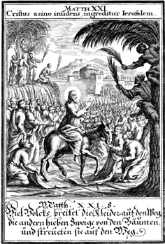 Description: Jesus enters Jerusalem on a donkey to the waving of palm branches and the placement of cloaks before Him.