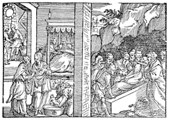 Description: Isaac and Ishmael lower Abraham’s body into a sarcophagus (right), while on the left, Rebekah gives birth to twin sons, Esau and Jacob, and Esau sells his birthright to Jacob for a bowl of stew (background).