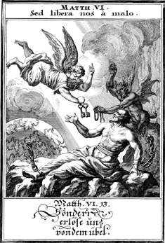 Description: An angel hands a prisoner of Satan the keys to his shackles as a rendering of the petition "Deliver us from evil" from the Lord's Prayer.