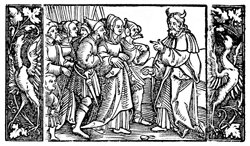 Description: Moses, depicted with horns, in the Egyptian court. It was common in Western art for Moses to be depicted with horns until after the Renaissance.