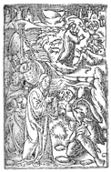 Description: Jesus heals a blind person (front) and casts out the Legion from the demoniac allowing them to go into a herd of pigs (rear).