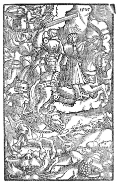 Description: After the first four seals are opened, four horsemen roam the earth bringing great calamity. They are shown carrying a bow, a sword, scales, and a pitchfork.