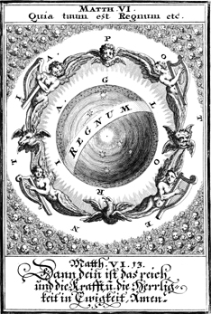 Description: The Latin Regnum (king) hovers over a depiction of the creation surrounded with the heavenly host. This illustrates the final petition of the Lord's Prayer, "For thine is the kingdom, power, and glory forever".