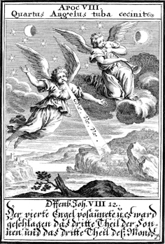 Description: At the sounding of the fourth trumpet the sun, moon, and stars are struck, and an angel cries out "Woe, Woe, Woe".
