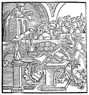 Description: A rendering of Paul at his writing desk (front) and preaching (rear).