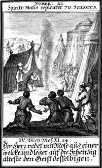 Description: God appears to Moses and the elders in a pillar of cloud.
