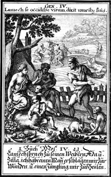 Description: Lamech informs his wives, Adah and Zillah, that he has killed a man who injured him, while the sons of Jabal (right) and Jubal (left) stand in the background.