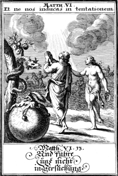 Description: God delivering a man from the nude adulteress as others partake in sex in the backgroud. The devil is rendered as a serpent on the left. This illustrates the petition "Lead us not into temptation" from the Lord's Prayer.