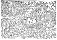Description: God speaks to Noah as the animals come into the ark prior to the beginning of the flood rains. The flood is depicted in the left rear.