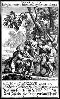 Description: Joseph’s brothers dip his tunic into goat’s blood before misleading their father Jacob into thinking that an animal has devoured Joseph. In the background, Rueben returns to rescue Joseph from the cistern, once used to hold him captive, only to find it empty.
