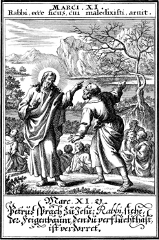 Description: Peter points out that the fig tree Jesus had cursed is withered.