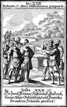 Description: Joshua confronts Reuben, Gad, and the half-tribe of Manasseh for making a pagan altar.