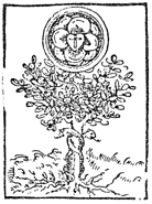 Description: The printer's device of Joseph Klug (fl. 1523-1552 ) consists of the Luther rose sitting on top of a tree with two snakes.