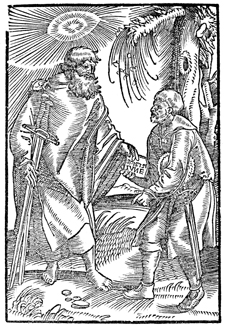 Description: Illustrating Paul's letter to the Galatians, this engraving shows the apostle with his attribute the sword (here, two swords) passing along a letter to a messenger (note his equipment for his journey: hat, sword, and shoes).